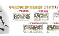 “5個(gè)嚴(yán)禁”“17”個(gè)不準(zhǔn)”和“5個(gè)一律” “5個(gè)嚴(yán)禁”:  嚴(yán)禁拉票賄選、嚴(yán)禁買官賣官、嚴(yán)禁跑官要官、嚴(yán)禁違規(guī)用人、嚴(yán)禁干擾換屆“17個(gè)不準(zhǔn)”:  1、不準(zhǔn)在民主推薦、民主測(cè)評(píng)、組織考察和選舉中搞拉票等非組織活動(dòng),通過宴請(qǐng)、安排消費(fèi)活動(dòng)、打電話、發(fā)短信、當(dāng)面拜訪、委托或者授意中間人出面說情、舉辦聯(lián)誼活動(dòng)等形
