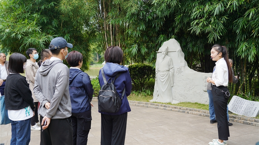 參觀的第二站是竹園,一走進竹園,“竹未出土先有節(jié)”這句漢白玉雕刻的詩詞在郁郁蔥蔥的竹林掩映下十分醒目。園區(qū)分為“頌竹”“品竹”“聽竹”“知竹”,完美地將“景”與風(fēng)清氣正的“廉”融合,構(gòu)成“半山半水半竹林”的雅致景色。在參觀過程中,講解員向大家訴說著古代清官廉吏的典故,感受著先輩們剛正廉明的優(yōu)秀品質(zhì),也體會到古往今來的“廉竹精神”。