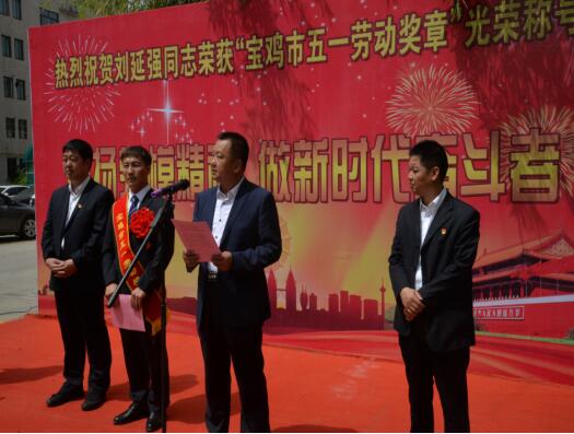 4月30日,寶雞市勞動者之歌暨慶祝“五一”國際勞動節(jié)大會勝利召開,公司劉延強同志被授予“寶雞市五一勞動獎章”光榮稱號,公司在總部辦公樓前舉行了簡樸隆重的歡迎儀式。公司副董事長、總經(jīng)理胥立,黨委書記景旭東,工會主席王建成等出席儀式,總部全體、寶雞文化藝術中心項目部管理人員參加。
