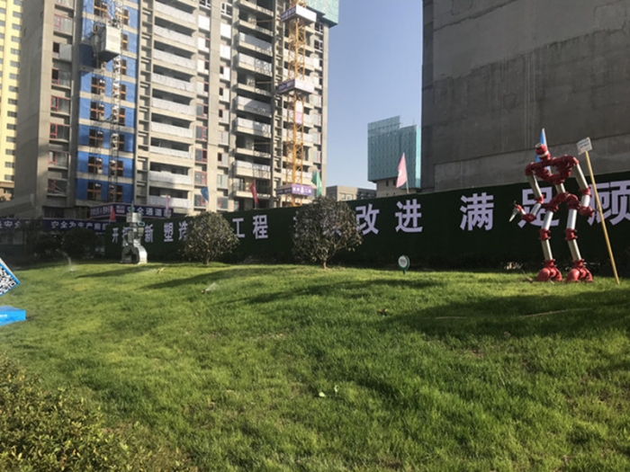 巧布園林式工地。項(xiàng)目在主題施工過程中就對園林景觀部分已穿插施工完成了一半,實(shí)現(xiàn)了真正意義的“園林工地”。