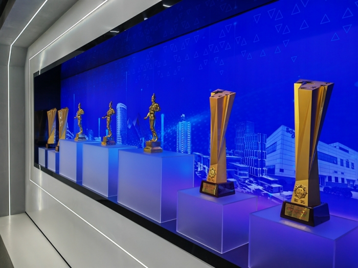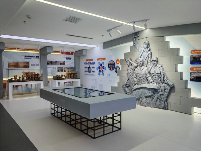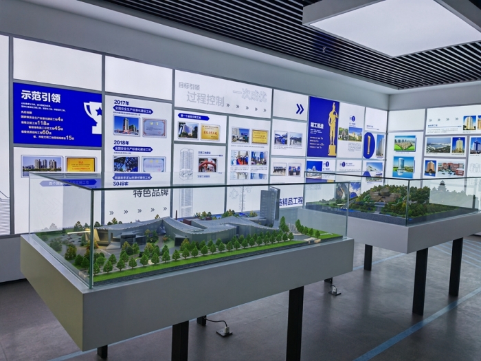 企業(yè)展覽館總面積516㎡,共分為四個(gè)展示單元,分別是:第一單元平地起高樓,主要展示集團(tuán)公司歷史沿革;第二單元風(fēng)雨筑輝煌,主要展示集團(tuán)公司壯闊征程;第三單元黨建強(qiáng)引領(lǐng),主要展示黨建、企業(yè)文化;第四單元公司榮譽(yù)展示;通過實(shí)物、展板、沙盤、模型、視屏、雕塑等表現(xiàn)手法,以圖、文、影、聲并茂的形式全方位呈現(xiàn)集團(tuán)公司走過的艱辛之路、創(chuàng)新之路、豪邁之路。